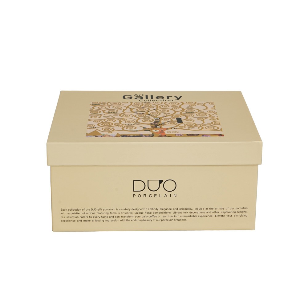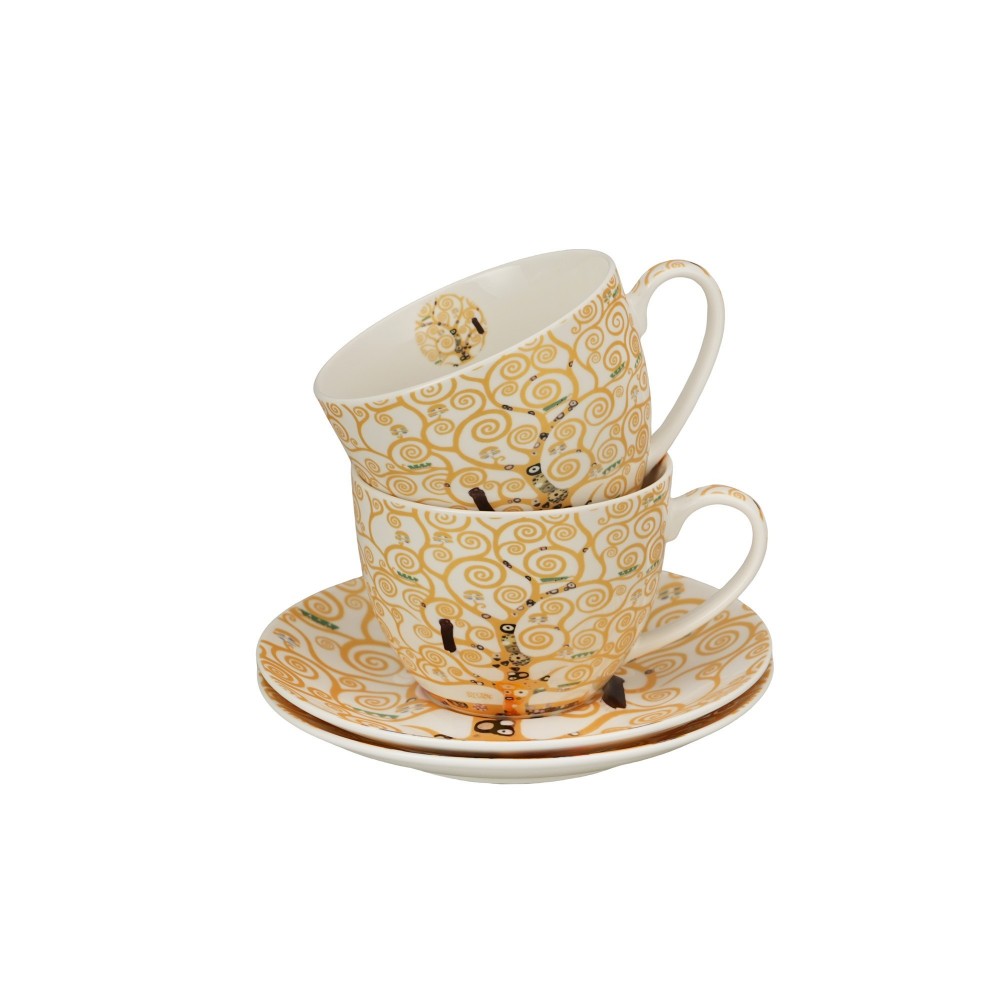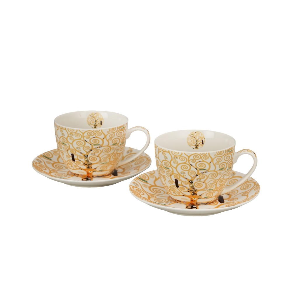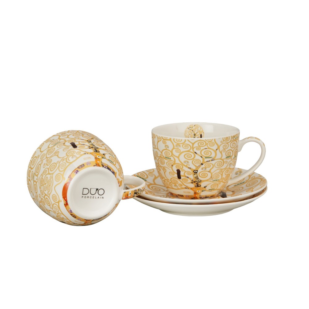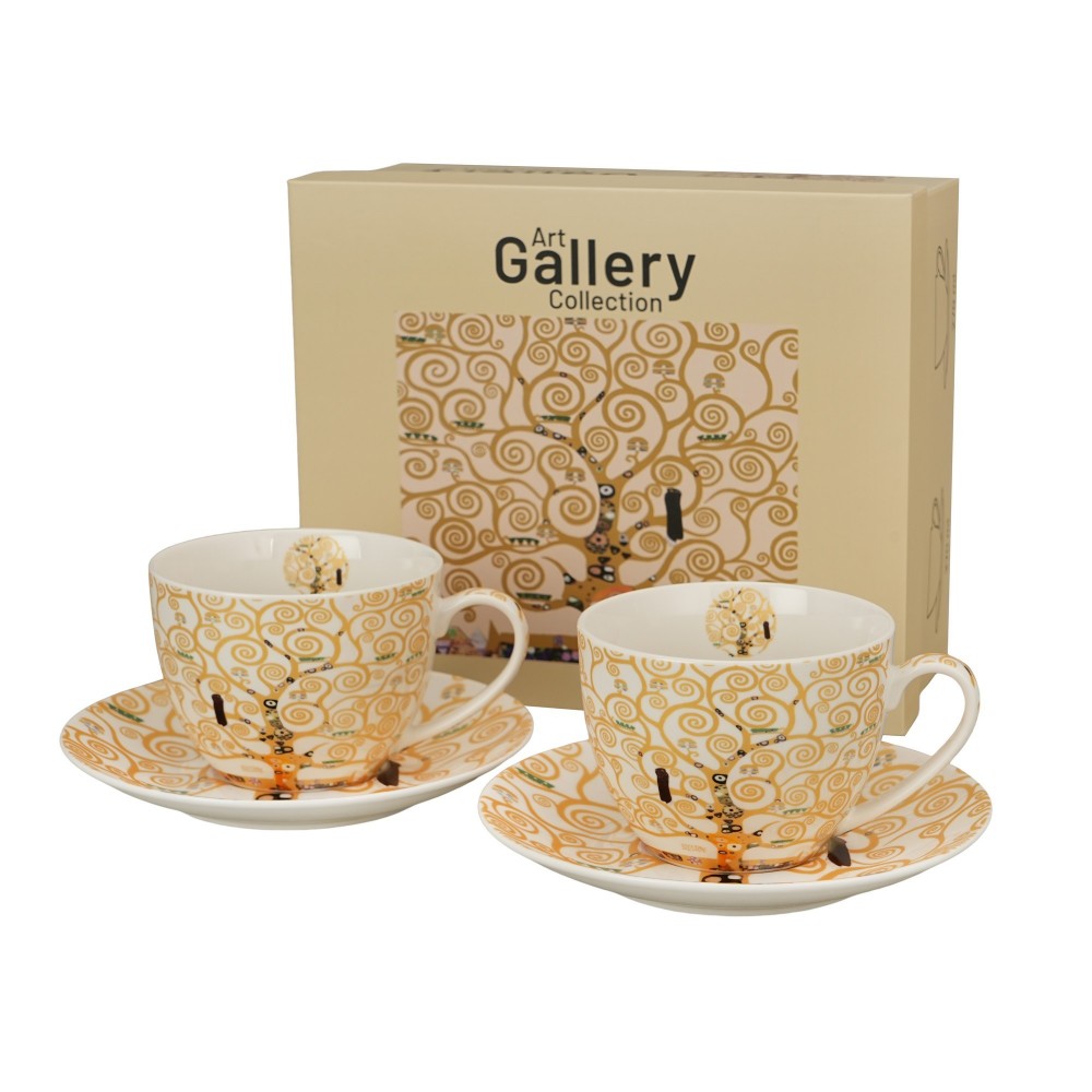 Dviejų 250 ml puodelių su lėkštutėmis rinkinys „GYVENIMO MEDIS“, įkvėptas Gustavo Klimto, iš „Art Gallery“ serijos, pagamintas iš „New Bone China“ porceliano, pasižymintis elegantiška ir natūralia kreminės baltos spalvos su subtiliu blizgesiu ir išskirtiniu patvarumu.