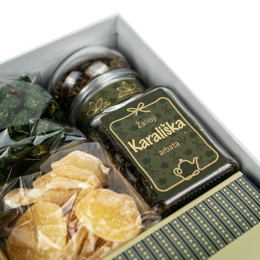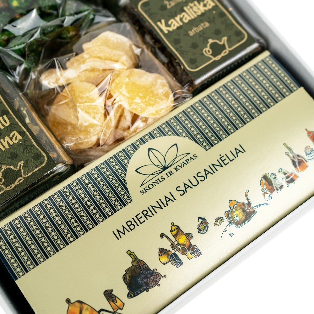 Išraiškingas rinkinys su žaliąja arbata, imbiero natomis ir traškiais užkandžiais, sukurtas žvaliems pojūčiams ir energingoms pertraukėlėms.