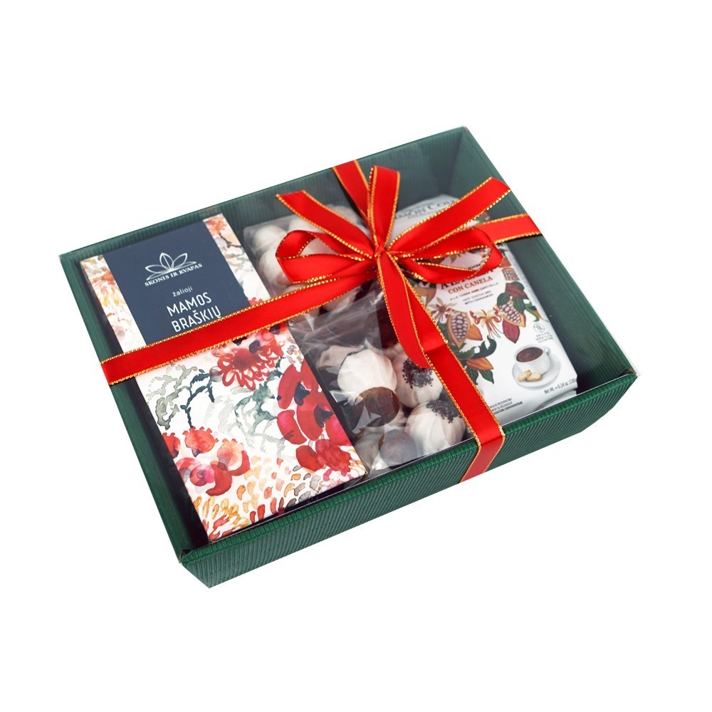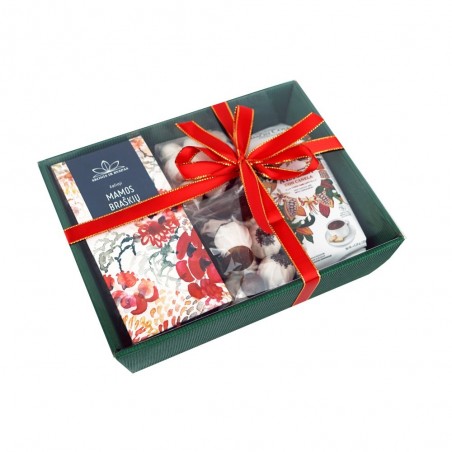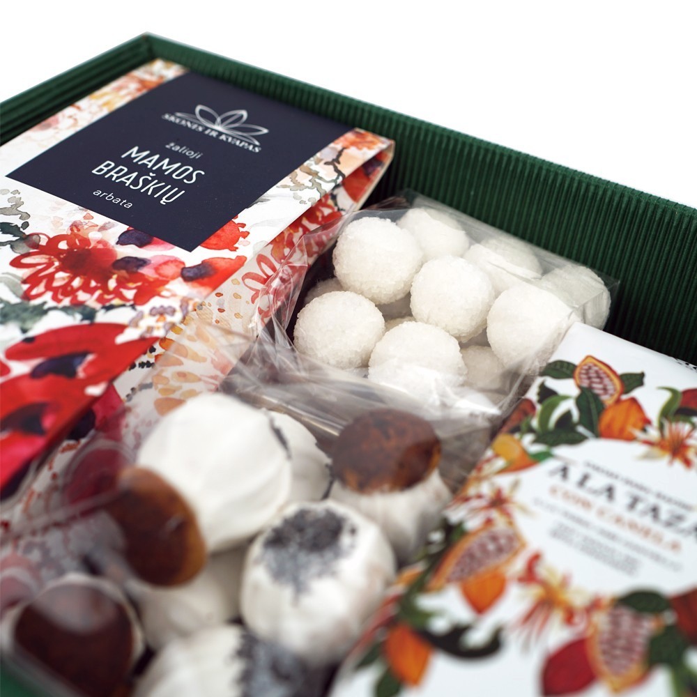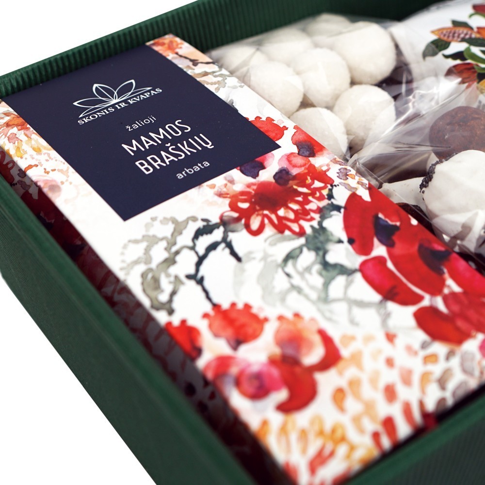 Lengvas rinkinys su kakavos gėrimu, aromatinga žaliąja arbata ir subtiliais saldumynais, tinkantis tiek kasdieniam pasilepinimui, tiek nedidelei dovanai.