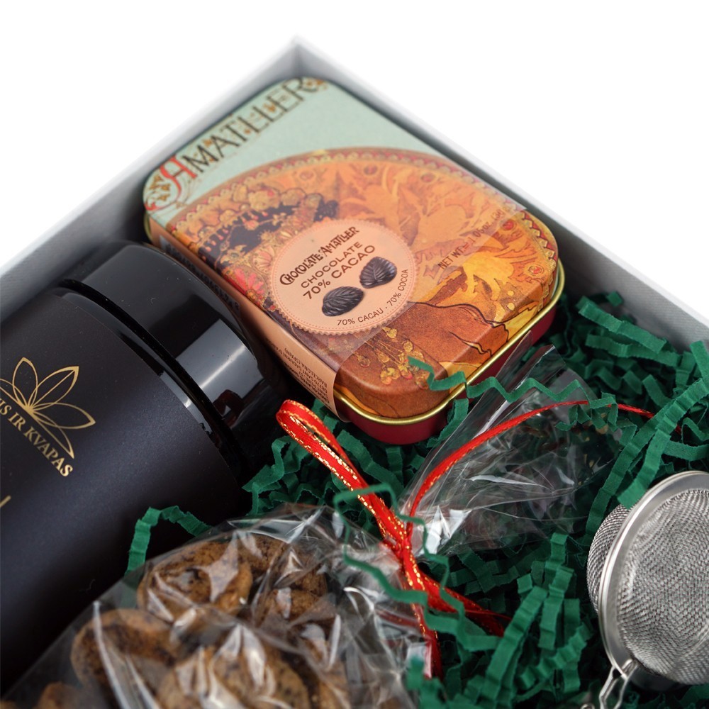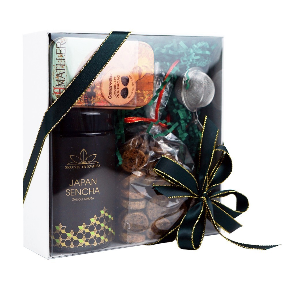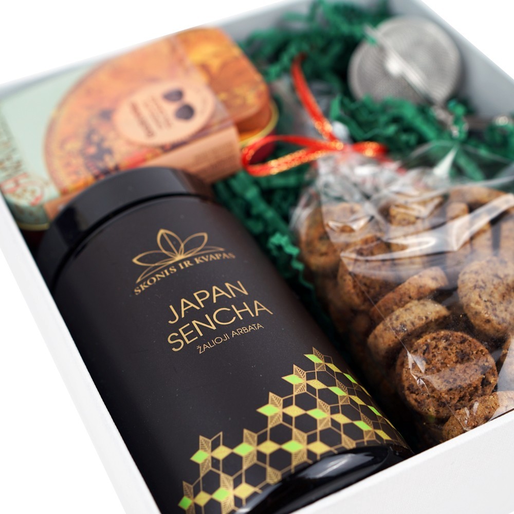 Klasikinis rinkinys, sujungiantis japonišką žaliąją arbatą ir sodrų juodąjį šokoladą, papildytas saldžiu užkandžiu ir praktišku arbatos sieteliu kasdieniam naudojimui.