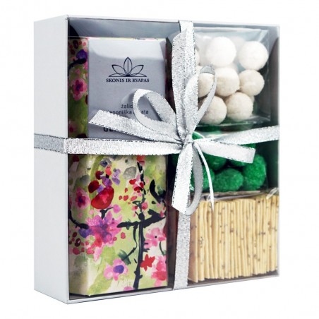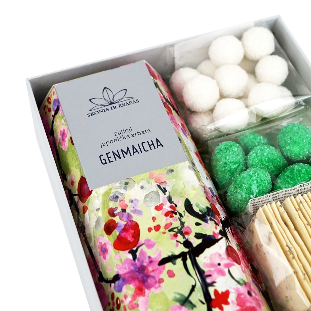 Rafinuotas rinkinys su japoniška žaliąja arbata ir subtiliais saldumynais, sukurtas ramioms, elegantiškoms akimirkoms bei lengvam pasilepinimui.